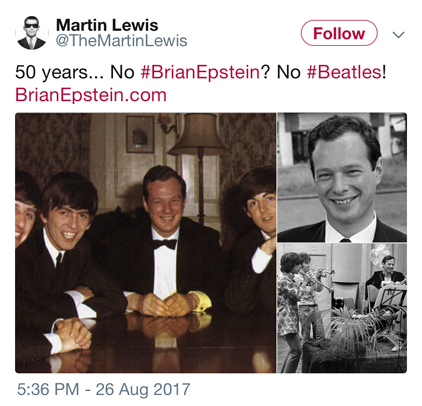 This is the official Website dedicated to celebrating the life and achievements of Beatles manager Brian Epstein, a man whose prescience, taste, vision and passion has left an indelible impact on our planet.